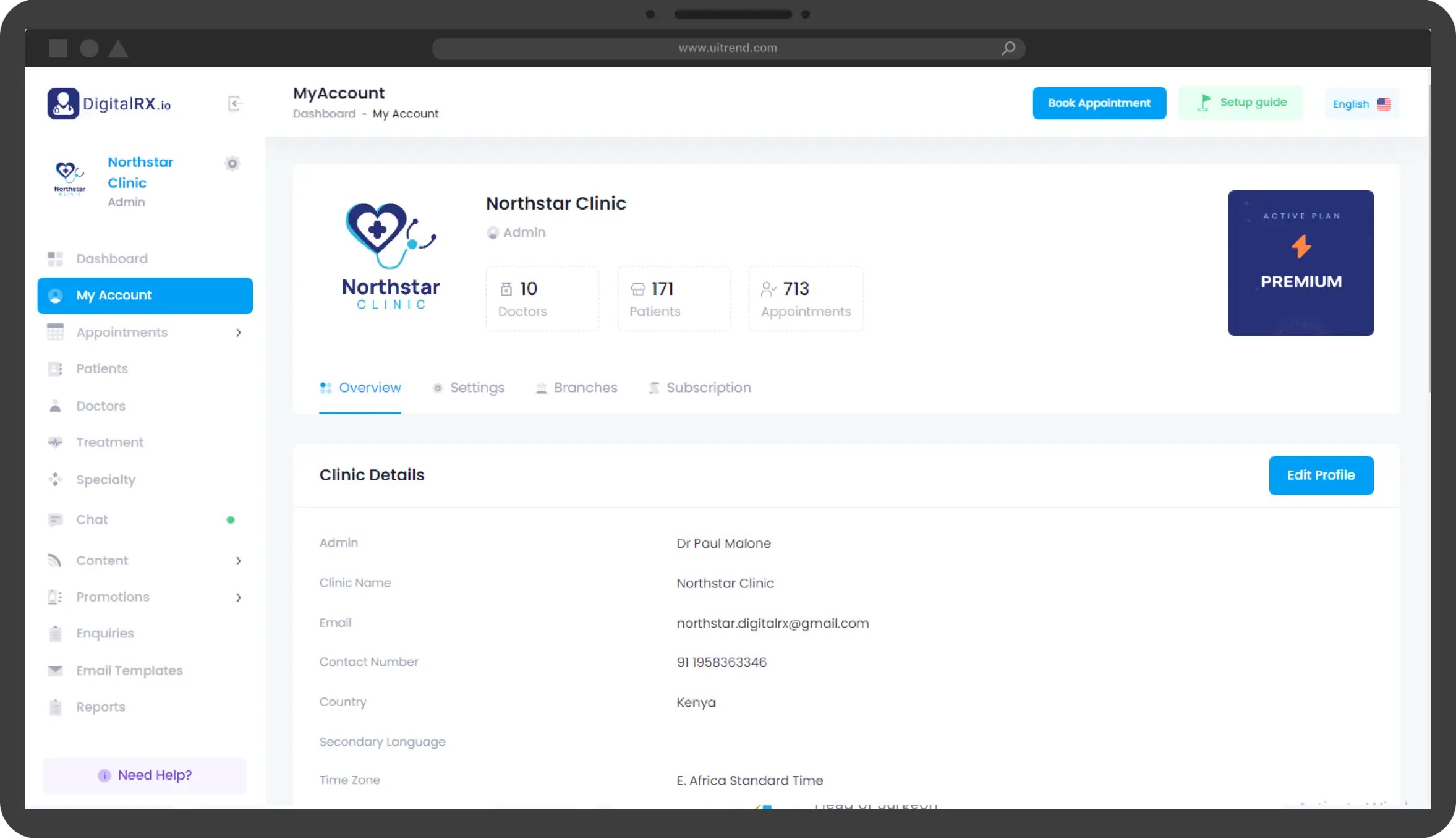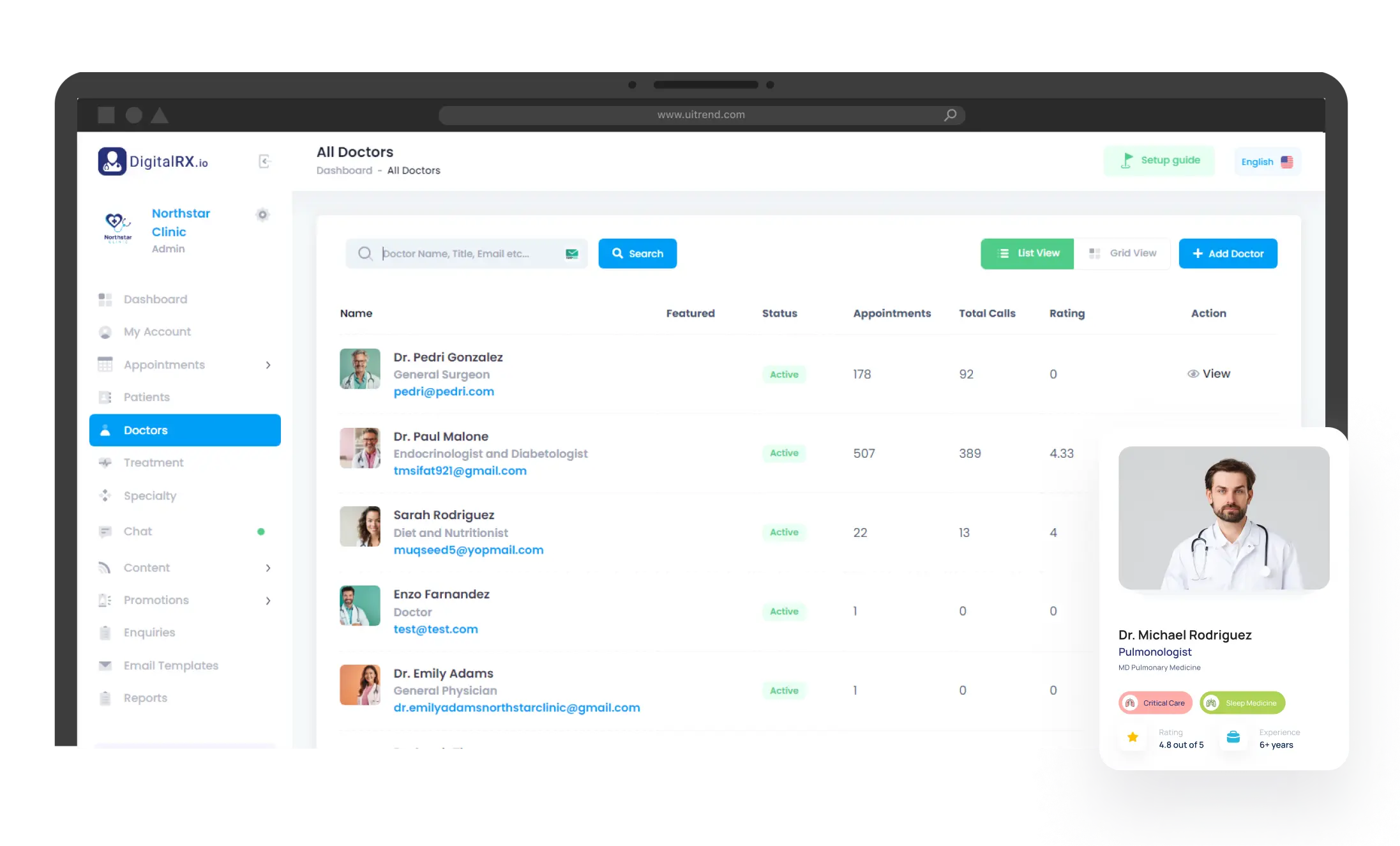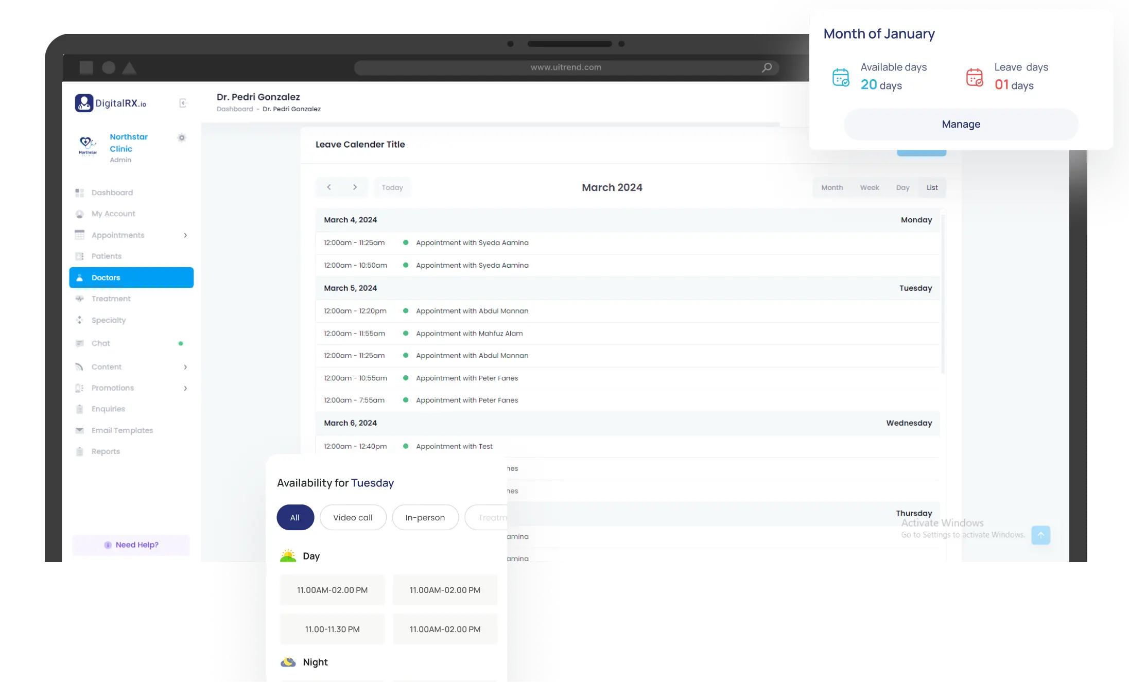 Manage your clinic effortlessly with the Clinic Admin portal on DigitalRX.io. Empower your receptionists or clinic managers to handle doctors' schedules, appointments, and communicate with patients in real-time through our intuitive chat feature. Share valuable health tips and promotions on the doctor wall, keeping your patients engaged and informed. Simplify payment management and gain valuable insights with comprehensive analytics and reports. Take control, simplify operations, enhance patient care, and elevate your clinic's success with our user-friendly admin portal