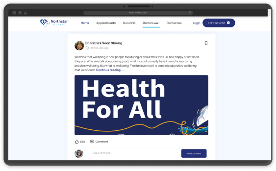 As a doctor, you have valuable knowledge and insights to share, and the clinic website gives you the perfect platform to connect with your patients. Use the Doctor Wall feature to post helpful health tips, updates, and success stories, so your patients can get trusted information directly from you. Engage with your patients through likes and comments, creating a sense of community and building stronger relationships. You can also promote health products and offer personalized recommendations to improve patient care. With Doctor Wall, you become a trusted source of healthcare information and build lasting connections with your patients.