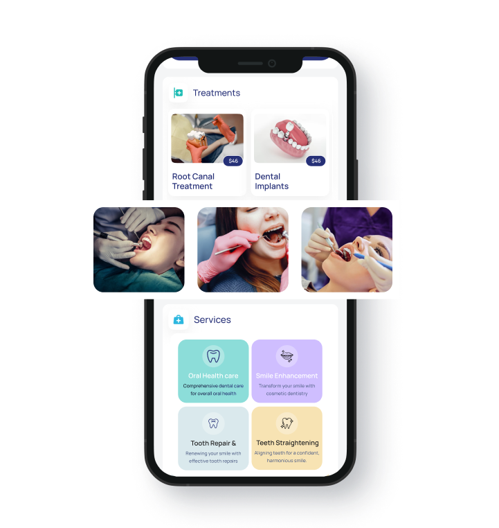Be it Root canal treatment, Dental cleanings, Regular dental check-ups, Cosmetic dentistry, or Dental Implants, feature them all on your branded clinic website and app. Allow your patients to explore details about various dental procedures, tests, and any other dental offerings, and help them make more informed decisions. Display before and after images of the treatments to gain more trust from your patients.