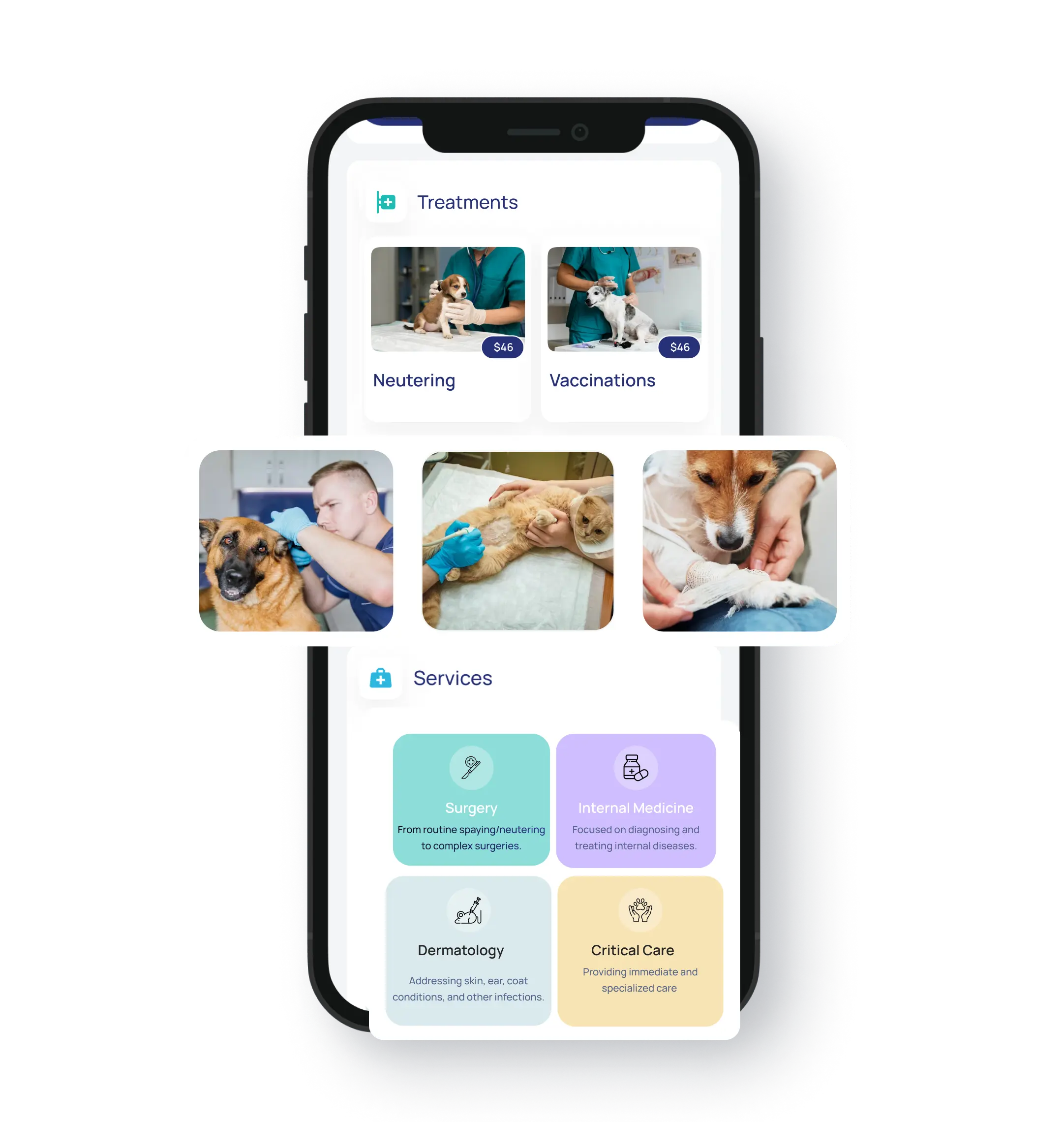 From comprehensive pet examinations to advanced veterinary procedures, present all your services on your branded clinic website and app. Enable pet owners to explore details about treatments, tests, and any other treatment offerings, helping them make informed decisions.