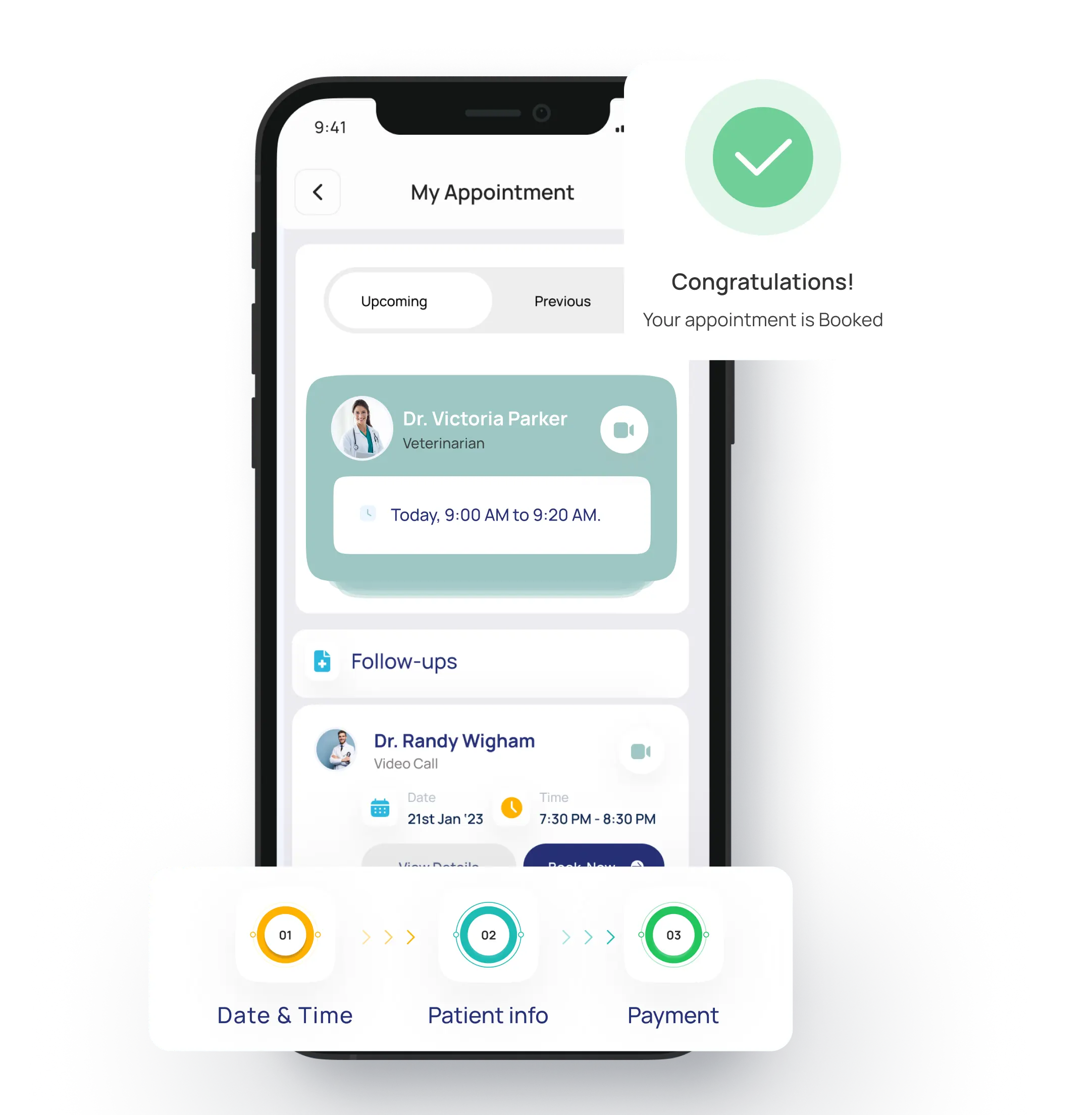 With your branded Clinic website and app, pet owners can easily view veterinarians' availability and book appointments for both clinic visits and online consultations. Eliminate the need for pet owners to call your clinic or for you to contact them to confirm the booking. A single click confirms the appointment and notifies both the veterinarian and the pet owner instantly.